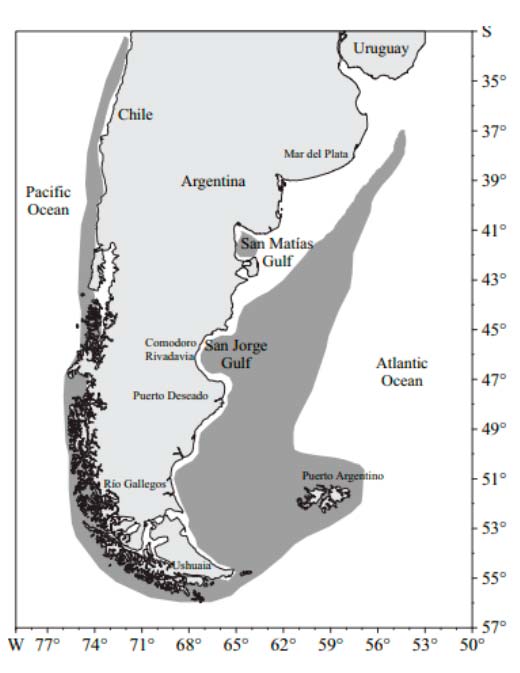 Patagonian grenadier (Macruronus magellanicus), also known as hoki, is one of the most important finfish resources in the Southwest Atlantic Ocean (SAO). Its general distribution comprises two geographical areas, namely the Chilean platform and slope in the Southeastern Pacific from Cape Horn to 33° S (Arana, 1970), and the Argentinean platform and slope in the Southwestern Atlantic between 36° S and 56° S (Angelescu et al., 1958), including the Strait of Magellan and Tierra del Fuego channels (Fenucci et al., 1974; Lloris and Rucabado, 1991). Its depth distribution is very broad, ranging from 20 to 600 m (Inada, 1983; Wöhler, 1987; Chesheva, 1995). In the Patagonian region, the species is found on the shelf and slope, associated with three different types of water masses with different salinities: Malvinas Current, coastal waters and shelf waters (Fedúlov et al., 1990). To the north of 45° S, it is related to the shelf break, following the Malvinas water mass.